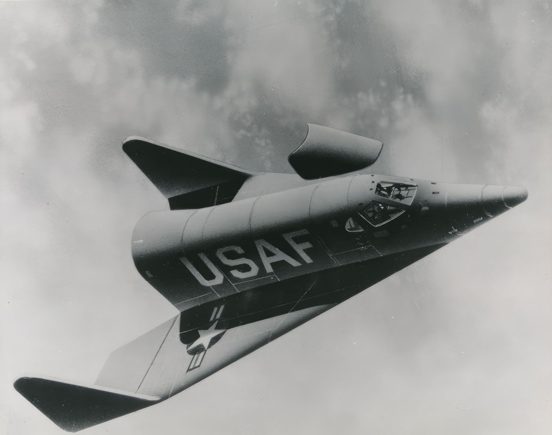 (NASA. X-20) Künstlerische Darstellung des Experimentalflugzeugs X-20 beim Wiedereintritt in die Erdatmosphäre. 1963. Silberabzug aus der Zeit. Taposcriptierte Legende auf der Rückseite. 25,3 x 20,3cm mit Rändern.