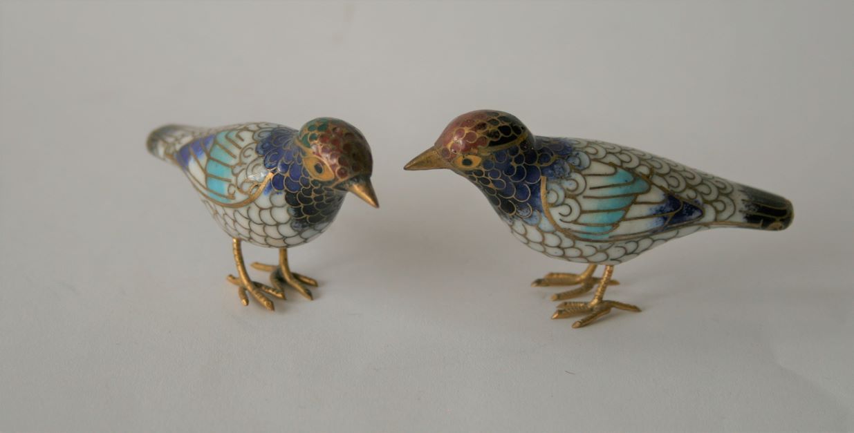 Ein Vogelpaar aus Cloisonné-Emaille, China, 20. Jahrhundert - Länge: 6,5 cm, Höhe: 3,5 cm