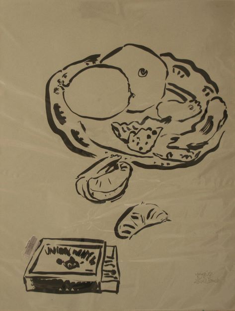 Moritz NEY (geb. 1947), luxemburgischer Künstler, Mischtechnik (Tusche und Collage) : Obstteller und Streichholzschachtel, unten rechts signiert und datiert 25.XII.2008 - Maße: 65 x 50 cm.