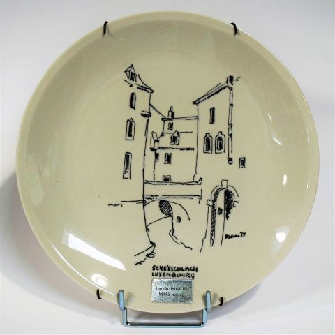 Teller aus weißem Porzellan mit einer Handzeichnung von Mars SCHMIT "Sche'eschlach Luxembourg", signiert und datiert 74, Durchmesser 26 cm