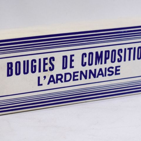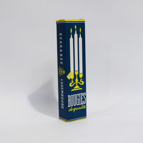 Pappschachtel mit der Aufschrift "Qualitätskerzen. SCARABÉE" mit 6 großen Kerzen, Verpackung in sehr gutem Zustand, 60/70er Jahre
