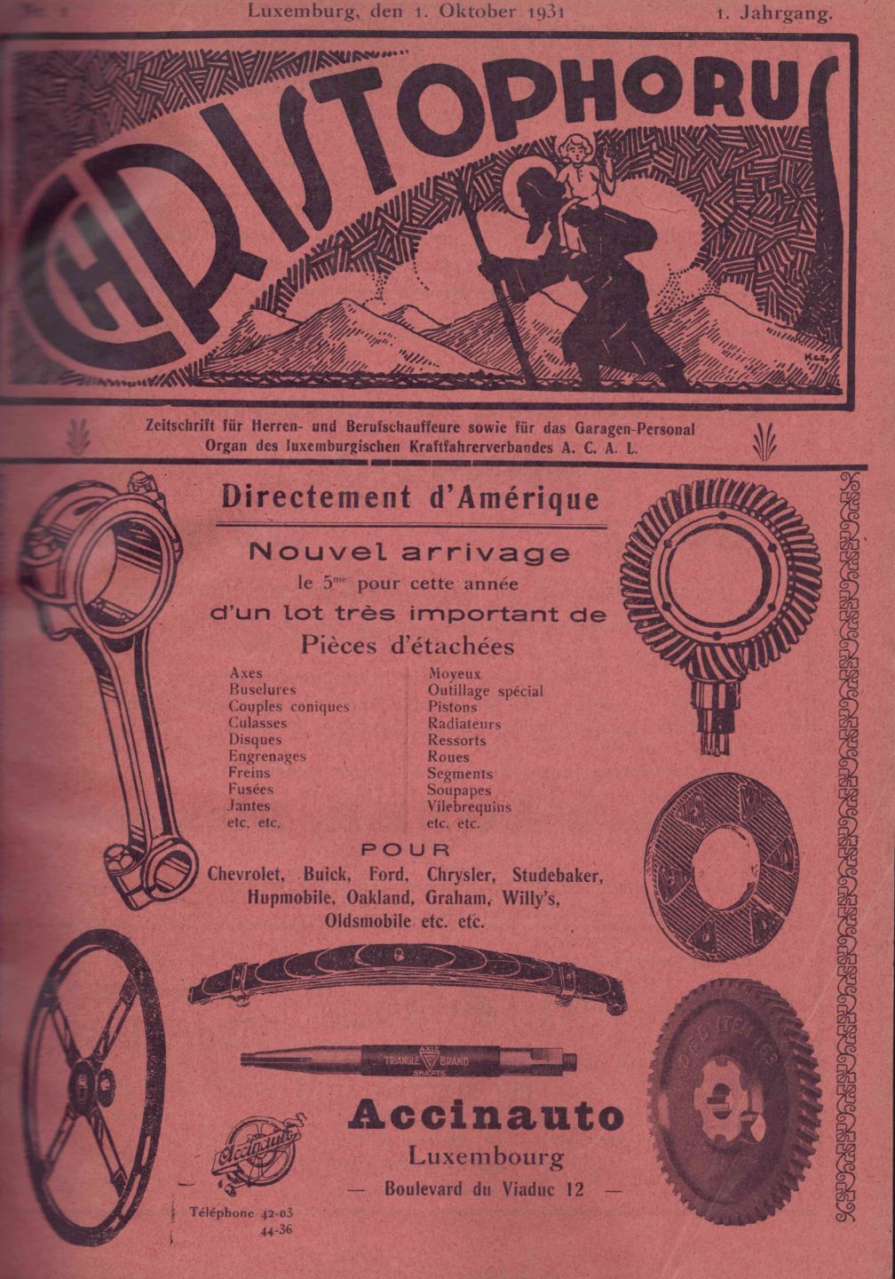 Zusammenstellung der Monatszeitschrift CHRISTOPHORUS, Zeitschrift für Herren- und Berufschauffeure sowie für des Garagen-Personal, in Halbleinen gebunden. Organ des luxemburgischen Kraftfahrerverbandes A.C.A.L., Kopf der Sammlung von #1 Oktober 1931 bis #12 September 1932. sehr guter Zustand