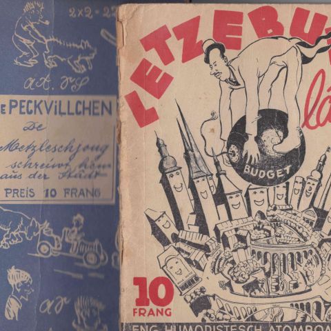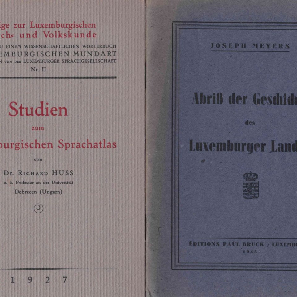 1. Joseph MEYERS: Abriß der Geschichte des Luxemburger Landes, Verlag Paul Bruck, Luxemburg, 1945, 2. Richard HUSS: Studien zum Luxemburgischen Sprachatlas, 1927 + Letzeburg lâcht Peck-Villchen, 1948 + De Peck-Villchen, 1949