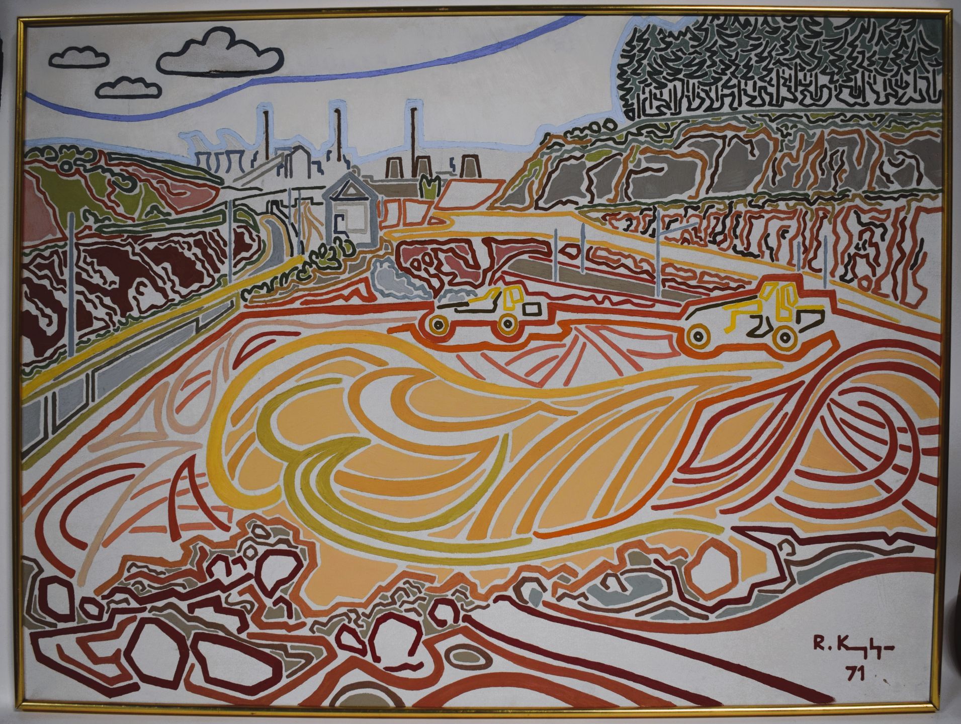 Roger KOEMPTGEN (1929-2000) [Prix Grand-Duc Adolphe 1964], Travail des machines sous les haut-fourneaux, Öl, unten rechts signiert und datiert 71, Riss in der Leinwand über 10 cm oben rechts, 90 x 120 cm