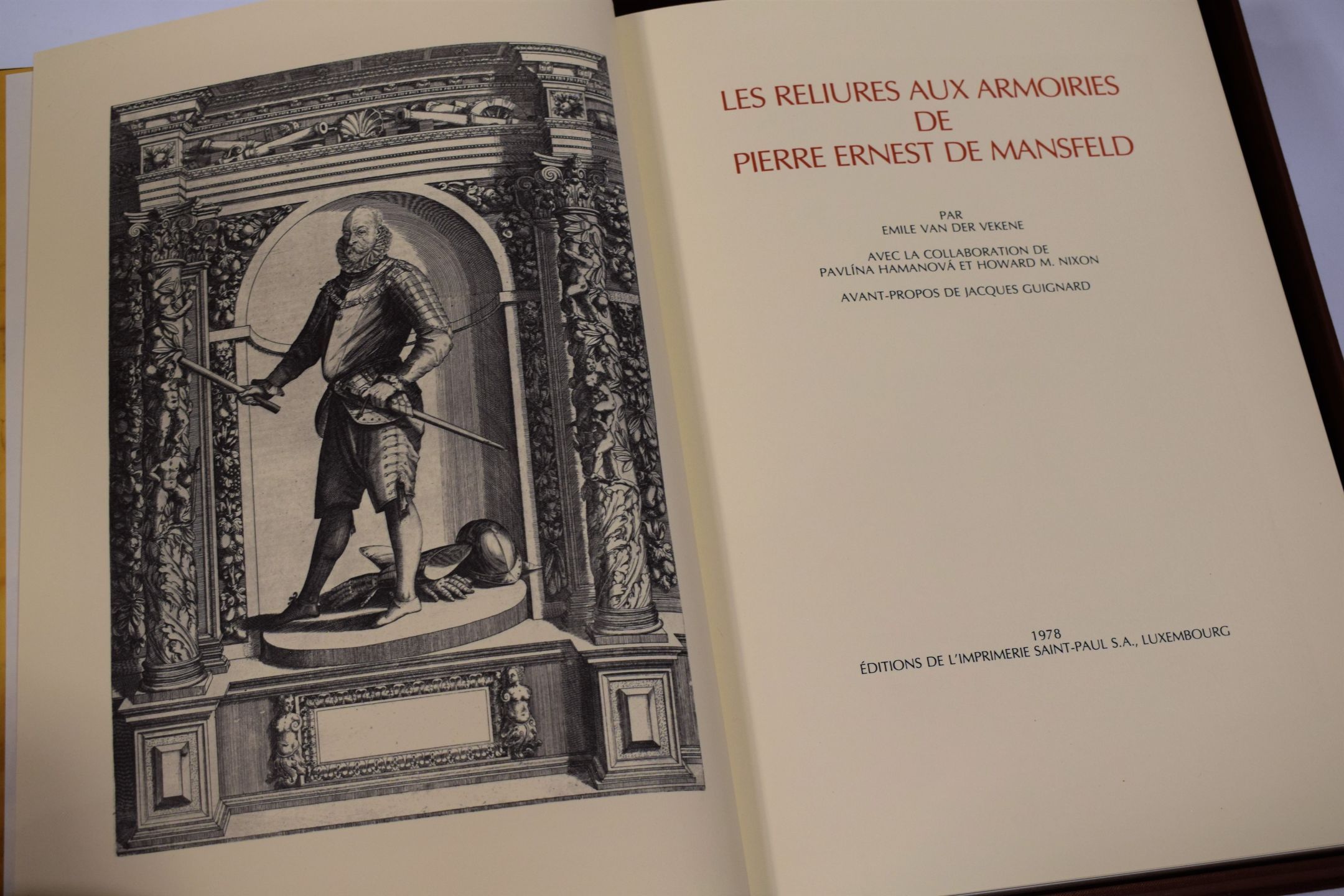 Emile Van Der VEKENE: Les reliures aux armoiries de Pierre Ernest de MANSFELD, 1978, édtions de l'Imprimerie Saint-Paul, Luxembourg, schöne Ausgabe in illustrierter Leinen-Schutzhülle, eines von 150 Exemplaren auf cremefarbenem Darwin-Papier (#A.23), 36 x 26,5 cm