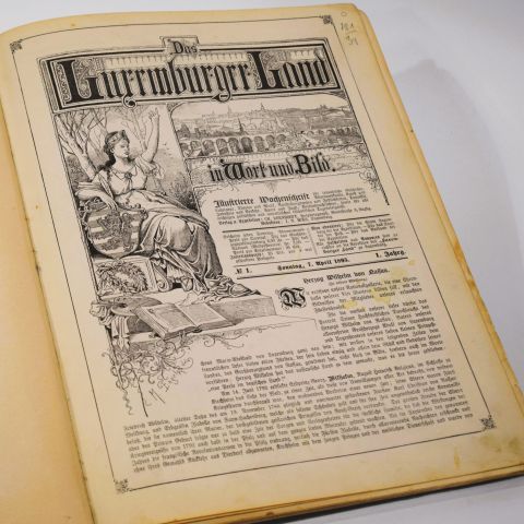 Schöner Ausgabeeinband mit dem ersten Jahrgang des LUXEMBURGER LAND, von #1 vom 7. April 1895 bis #39 vom 29. Dezember 1895, schönes Perkalin, der Deckel flankiert vom großherzoglichen Wappen und Titel in Schwarz, "Herausgegeben von Charles BERNHOEFT, Hosphotograph Luxemburg", guter Zustand.