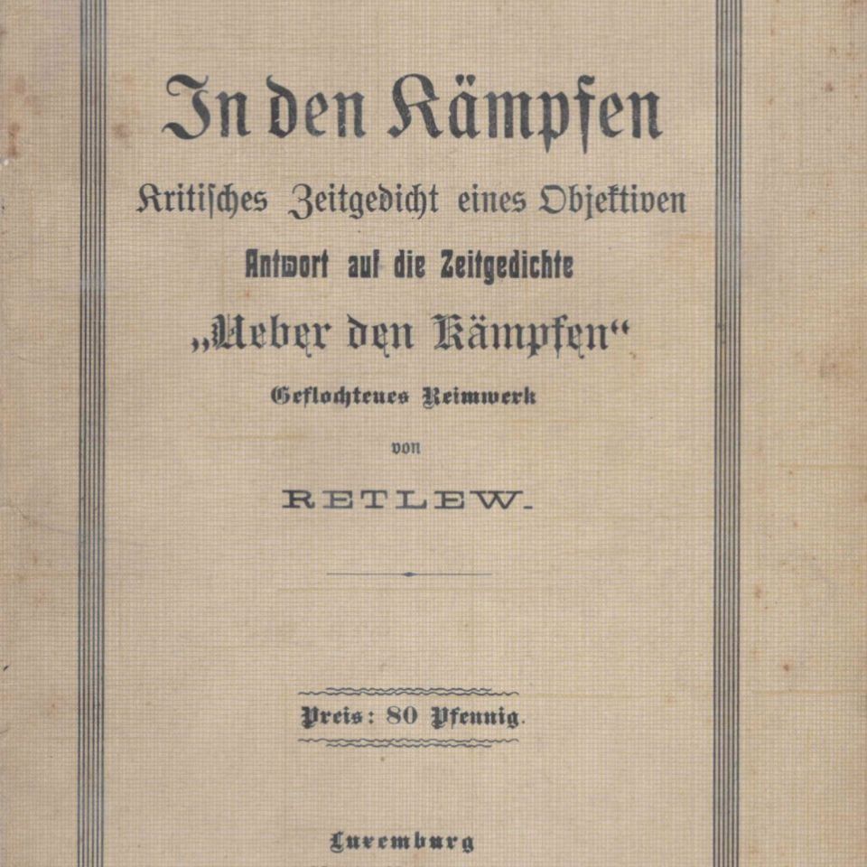RETLEW: In den Kämpfen, kritisches Zeitgedicht eines Objektivs, Antwort auf die Zeitgedichte "Ueber den Kämpfen", Luxemburg, Verlag Math. Kraus, 1915