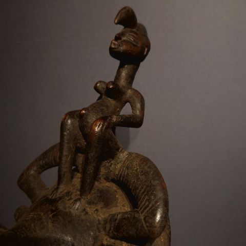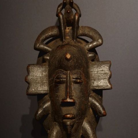 Eine sehr wichtige und perfekte Maske der Sénoufo (Mali). Die Sénoufos sind eine westafrikanische Bevölkerung, die in Burkina Faso, Südmali und der Elfenbeinküste lebt. Die Sénoufos sind hauptsächlich Bauern, die Reis, Hirse, Mais, Yams, Baumwolle, Karité, Mango und Tee anbauen. Es ist üblich, die Ernte und die Aussaat mit großen gemeinsamen Ritualen zu feiern, bei denen die wunderschönen, kunstvoll gearbeiteten Masken zum Einsatz kommen, die bei Sammlern sehr begehrt sind. H. ca. 38cm