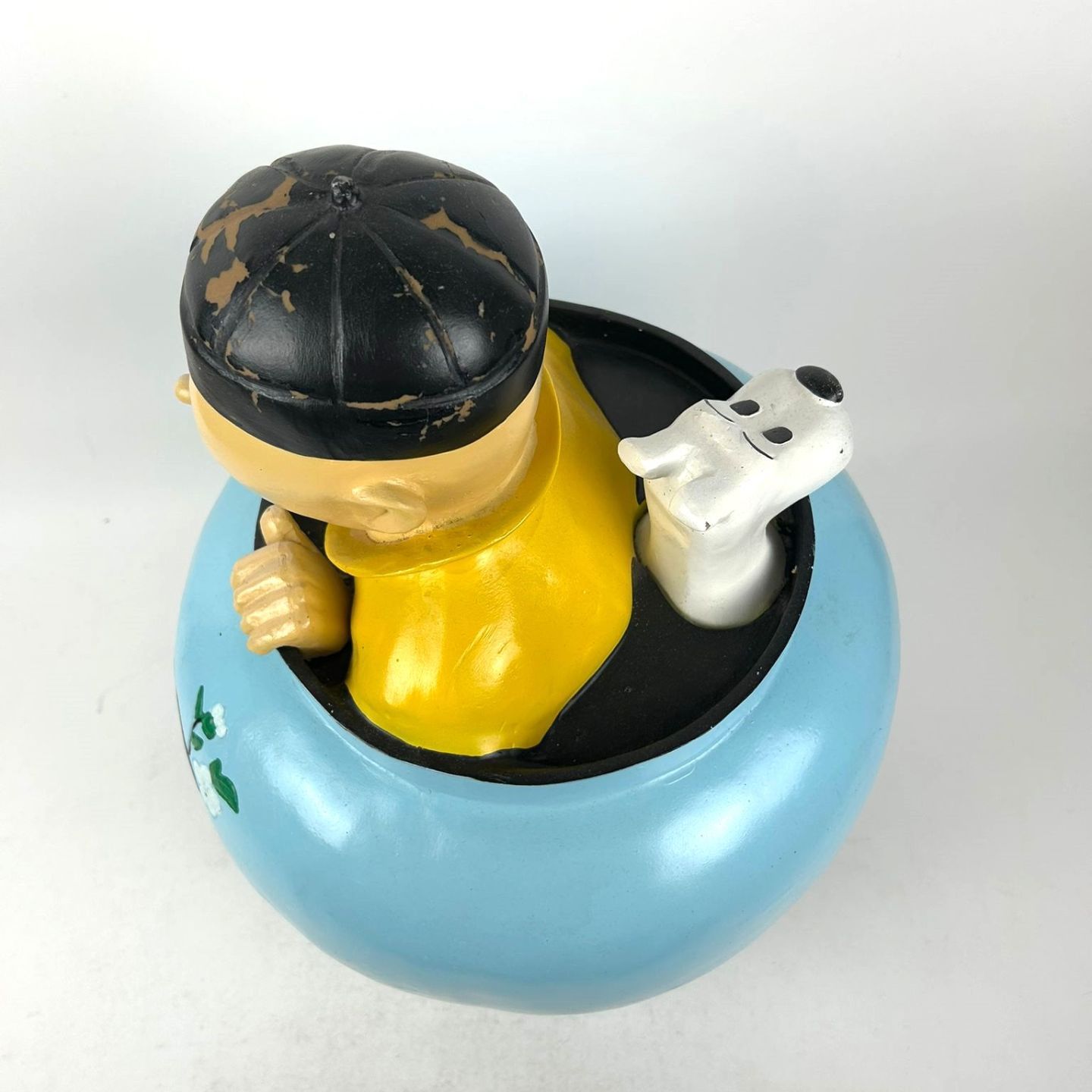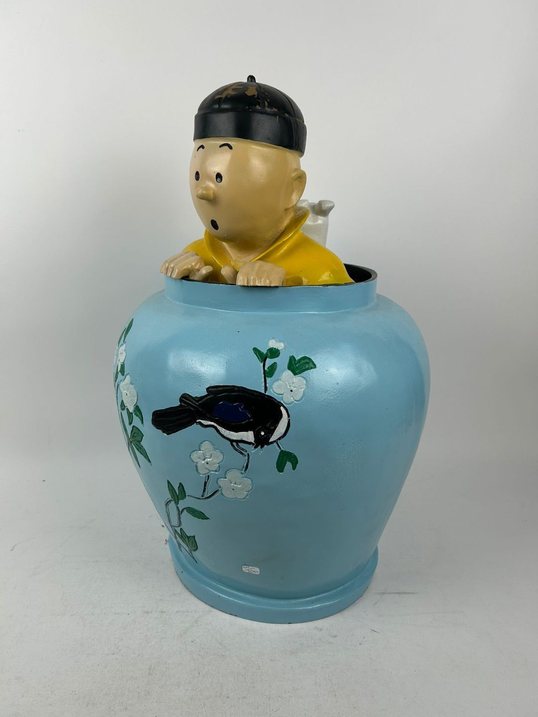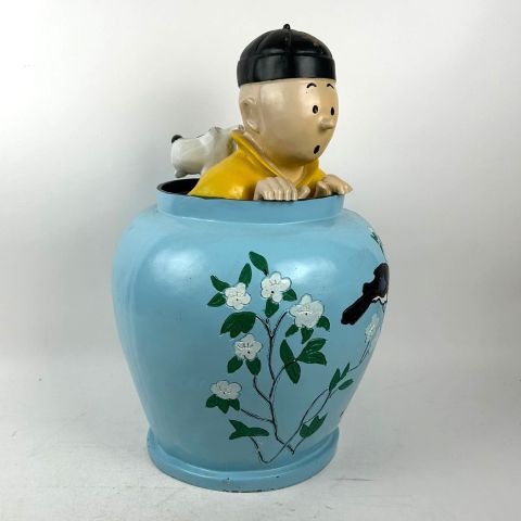 TINTIN - SAMMLUNG. Seltene Harzstatuette, die Tim und Struppi als Chinesen verkleidet in einer chinesischen Potiche in "Der blaue Lotus" darstellt.