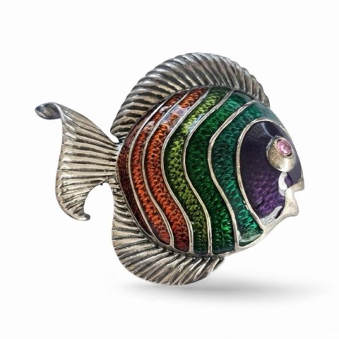 Brosche aus 925er Silber in Form eines Fisches mit farbiger Emaillierung, 15,9 g