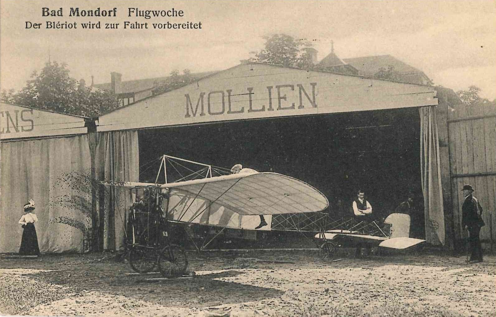 Postkarte 1910: Blériot bei der Vorbereitung für den Flugbetrieb in Mondorf-Les-Bains