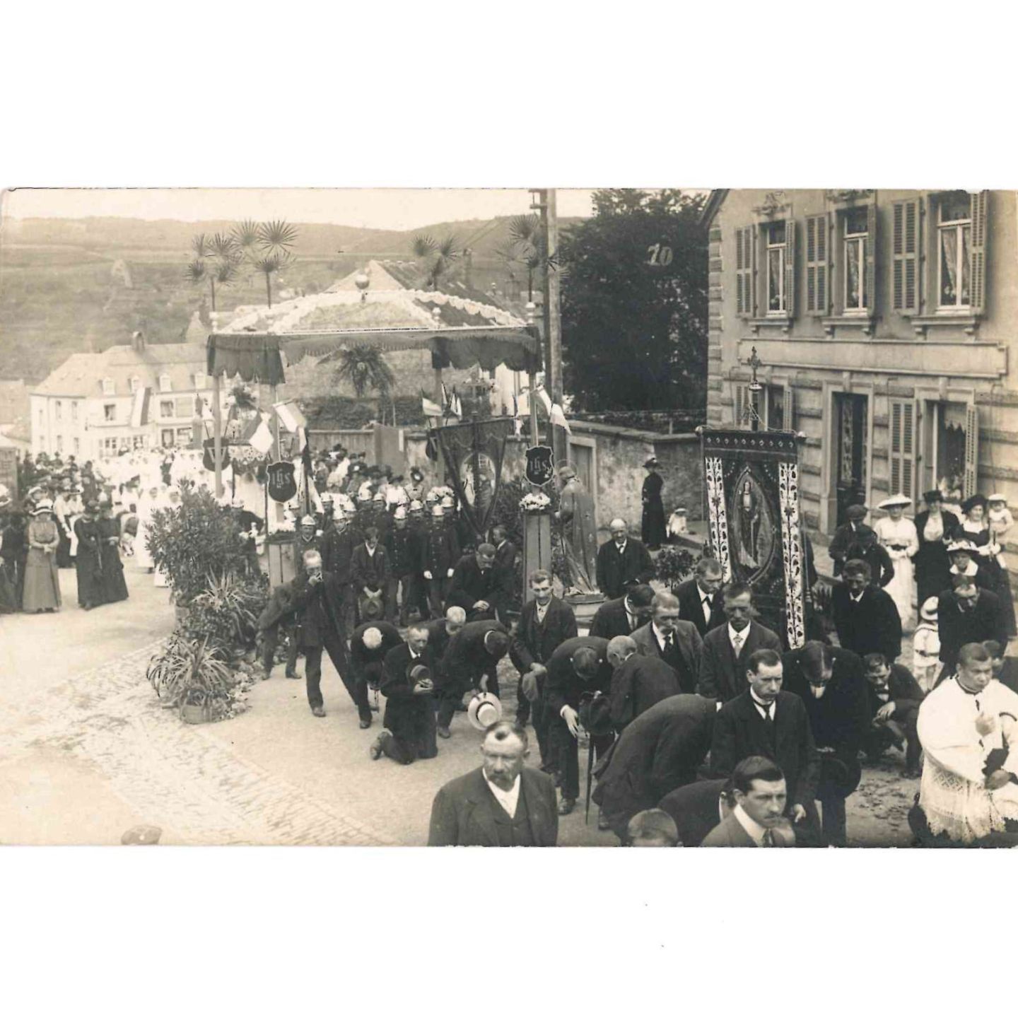 Fotokarte der religiösen Prozession in Wiltz mit Feuerwehrleuten im Jahr 1910