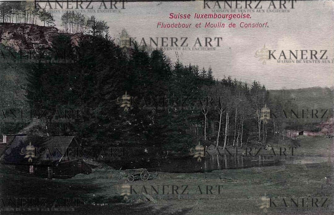 Kolorierte Postkarte des Fluodebour und der Mühle von Consdorf, um 1905