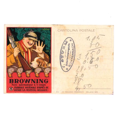 HANDEL. In Italien herausgegebene Postkarte für die Gewehrmarke Browning, die von dem Echternacher Büchsenmacher J. Sturm vertrieben wurde.