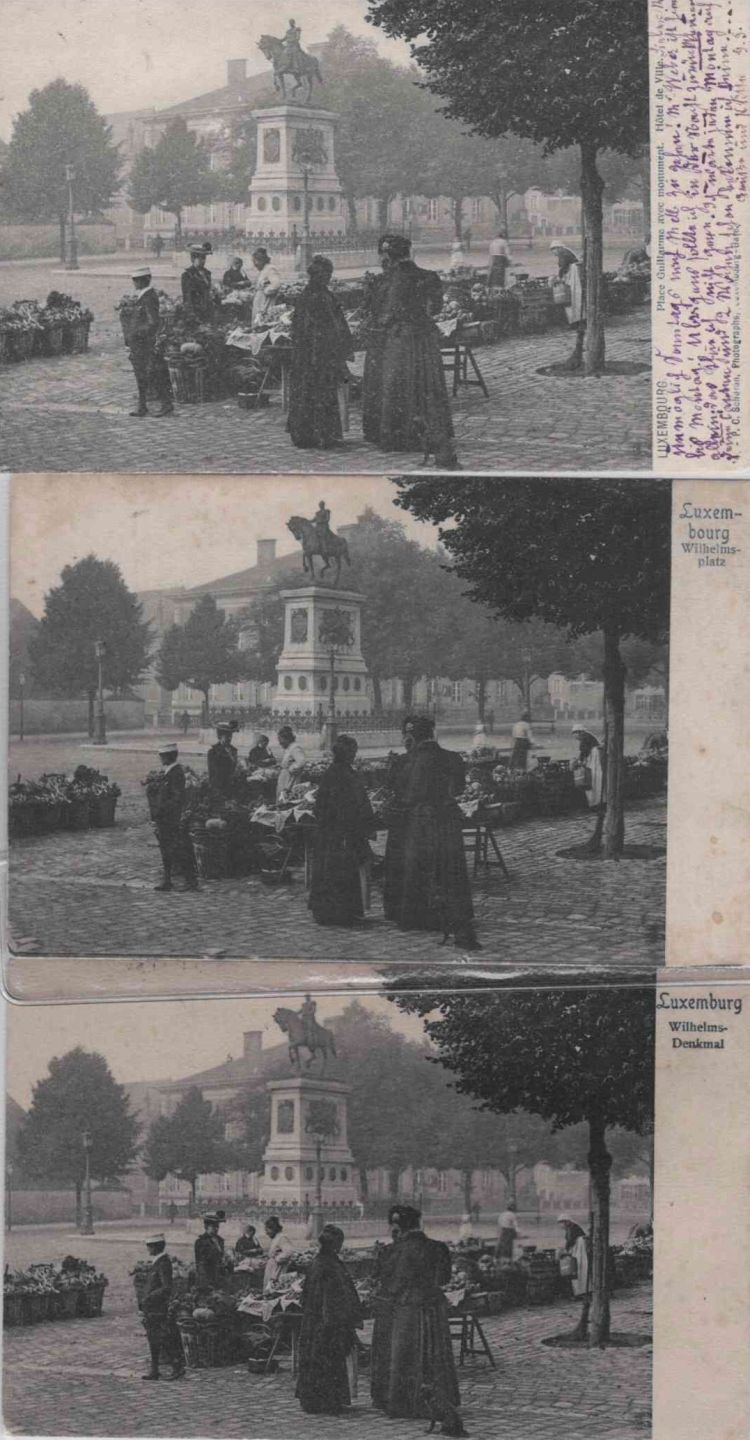 VDL. Postkartensammlung der Ansicht des Marktes am Place Guillaume mit 3 verschiedenen Texten, Schoren Verlag, ca. 1905