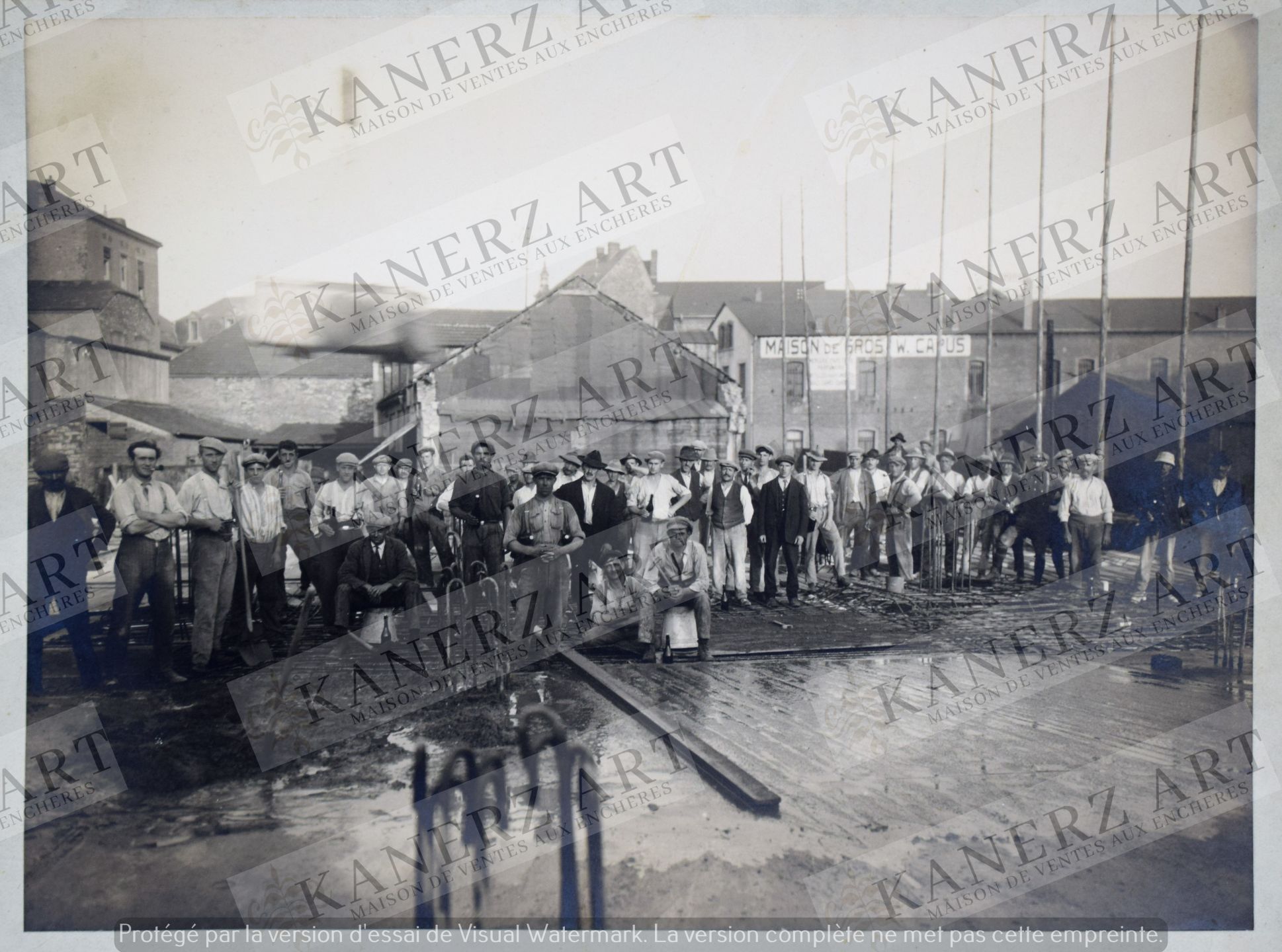 BAUARBEITEN. Großes Foto auf festem Karton, das eine Gruppe von Arbeitern beim Bau eines Gebäudes in der Stadt zeigt, von dem Fotografen Bernard KUTTER, Anfang der 20er Jahre.