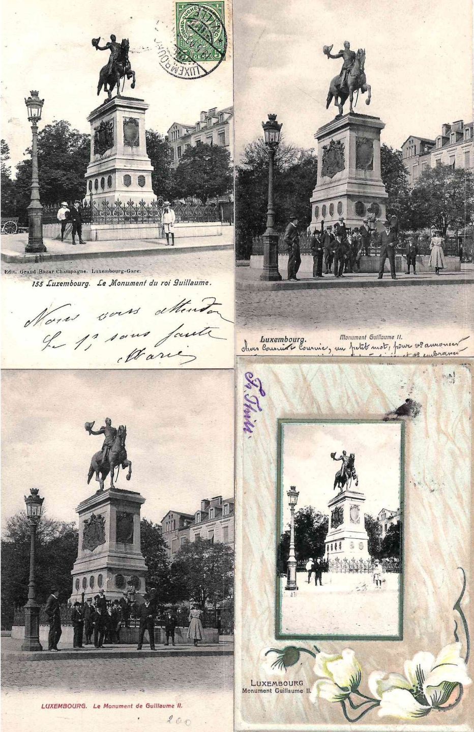 VDL. Eine Zusammenstellung von 4 Postkarten des Wilhelm II. Denkmals, Ausgabe Grand Bazar Champagne, 2 Karten mit demselben Foto, aber unterschiedlichem Design, 1905-1910