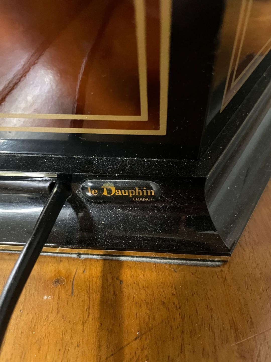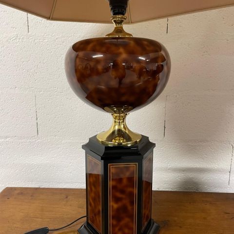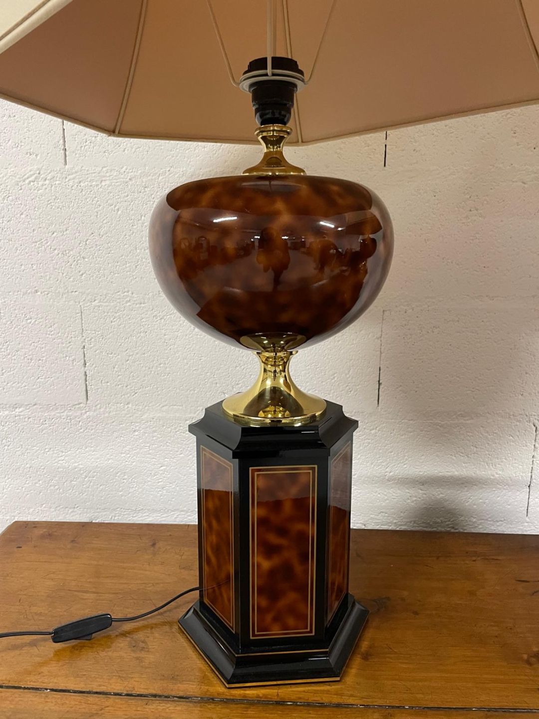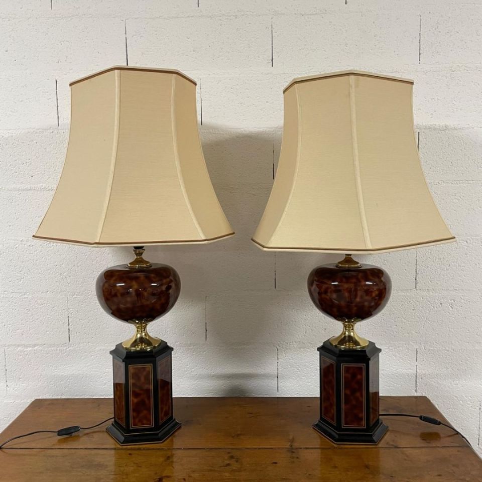Ein Paar SALONLAMPEN, Marke Le Dauphin. Mit sechseckigem Fuß. Bakelit, Metall und Messing, signiert auf dem Sockel, 60er Jahre.