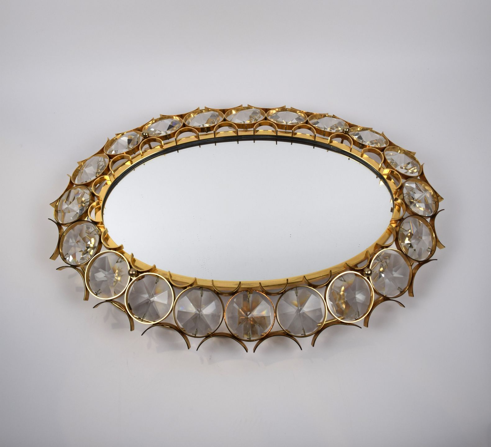 PALWA. Spiegel aus vergoldetem Messing und Dekor aus diamantgeschliffenen Kristallampeln, Österreich um 1960.