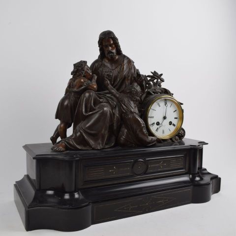 Napoleon III. PENDULE aus schwarzem Marmor mit einer Regula-Skulptur von Jesus, der die kleinen Kinder zu sich kommen lässt.