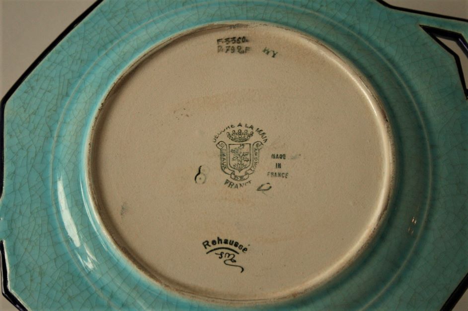Achteckige Schale mit 2 Henkeln aus emailliertem Steingut von LONGWY, rehaussiert von Simone MASSON, 50er Jahre - Durchmesser: 29,5 cm