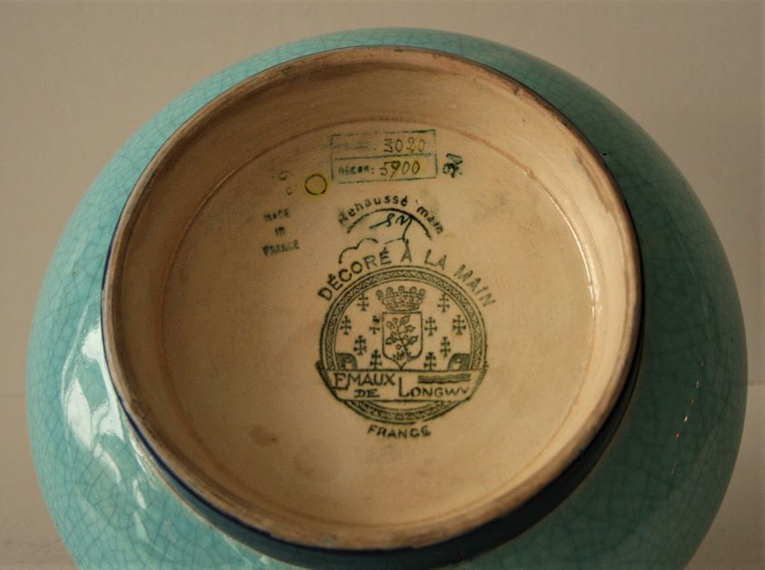 Schale auf rundem Fuß aus emailliertem Steingut aus LONGWY, erhöht von Simone MASSON, 50er Jahre - Durchmesser: 20 cm / Beiliegend eine Schale aus den 70er Jahren mit kleinem Kratzer am Rand - Durchmesser: 19 cm