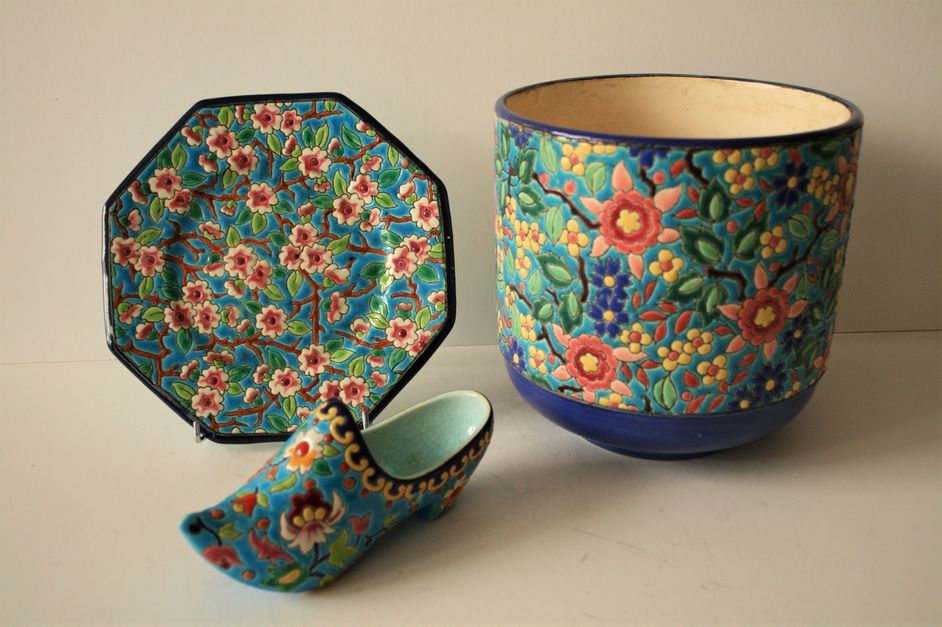 Set von Objekten aus emailliertem Steingut aus LONGWY: Cache-Pot aus den 30/40er Jahren, erhöht von André MASSON - Höhe: 17 cm, Sabot und achteckiger Teller aus den 50er Jahren.