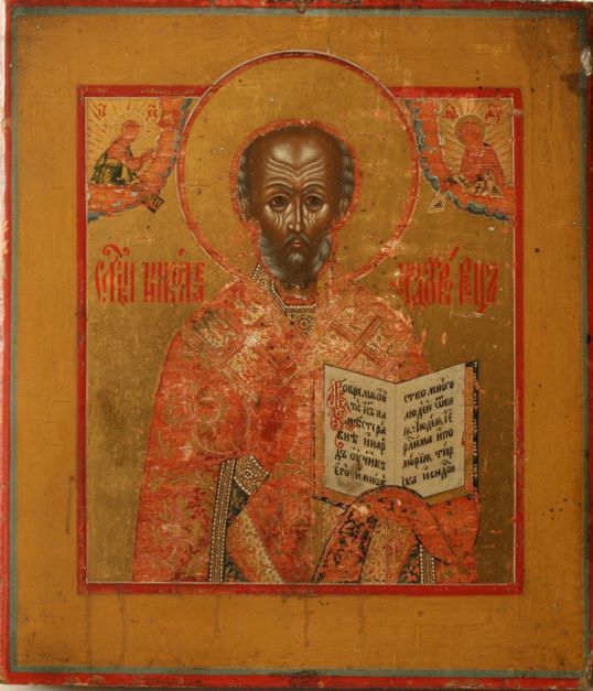 Polychrome Ikone mit Blattgold, die den Heiligen Nikolaus darstellt, der ein heiliges Buch trägt, das in Protoslawisch geschrieben ist, Ende des 19. Jahrhunderts, byzantinischer Stil, Christus und die Jungfrau Maria in den Ecken - Herkunft Balkangebiet, Gesicht und Hände zeremoniell gerieben - Maße: 23 x 20 cm