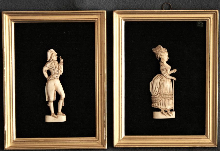 Ein Satz von zwei rechteckigen Rahmen mit einem "Incroyable" und einer "Merveilleuse" aus Elfenbein, Epoche Directoire - Höhe der Figuren: 9,7 cm