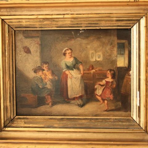 Öl auf Holz, Französische Schule Mitte 19. Jh.: Menuet dans l'arrière cuisine (Kratzer und kleine Fehlstellen im oberen Mittelteil) - Maße: 28 x 33,5 cm