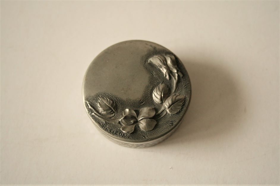 Jean-Maurice PETIZON (1855-1922), französischer Künstler, Pillendose aus Zinn, Deckel mit Blumendekor, gehämmerte Kontur, vertiefte Signatur auf dem Deckel - Durchmesser: 5,5 cm