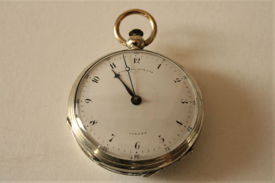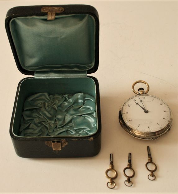 Silberne Taschenuhr aus der Louis-XVI-Zeit, sogenannte "de carrosse"-Schlagwerkuhr, graviertes Gehäuse, EARDLEY NORTON London, 3 Schlüssel zum Aufziehen - Durchmesser: 5 cm, Dicke: 2 cm