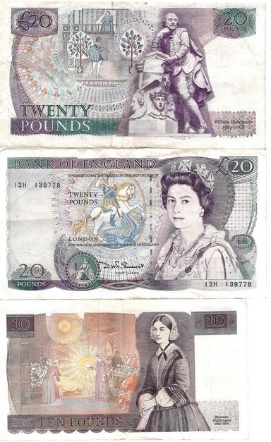 Banknotensatz der Bank of England: 2 x 20 Pounds William Shakespeare & 3 x 10 Pounds Florence Nightingale (2 mit Kugelschreiberschrift)