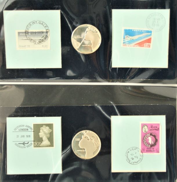 Satz von 2 Briefmarken und Silbermünzen zur Erinnerung an Flugverbindungen mit Abstempelung der Briefmarken jedes Landes am 21. Januar 1976: Jungfernflug PARIS-RIO DE JANEIRO in CONCORDE und Jungfernflug LONDON-BAHREIN, sehr guter Zustand - Gewicht: 40,4 g
