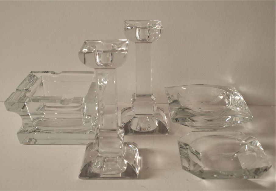 Quadratischer Aschenbecher aus Sèvres-Kristall, ohne Streifen - Maße: 12 x 12 cm + 2 Kerzenhalter aus Kristall von VILLEROY & BOCH - Höhe: 15 cm + 2 quadratische Aschenbecher von VAL SAINT LAMBERT - Seite: 10 & 11 cm