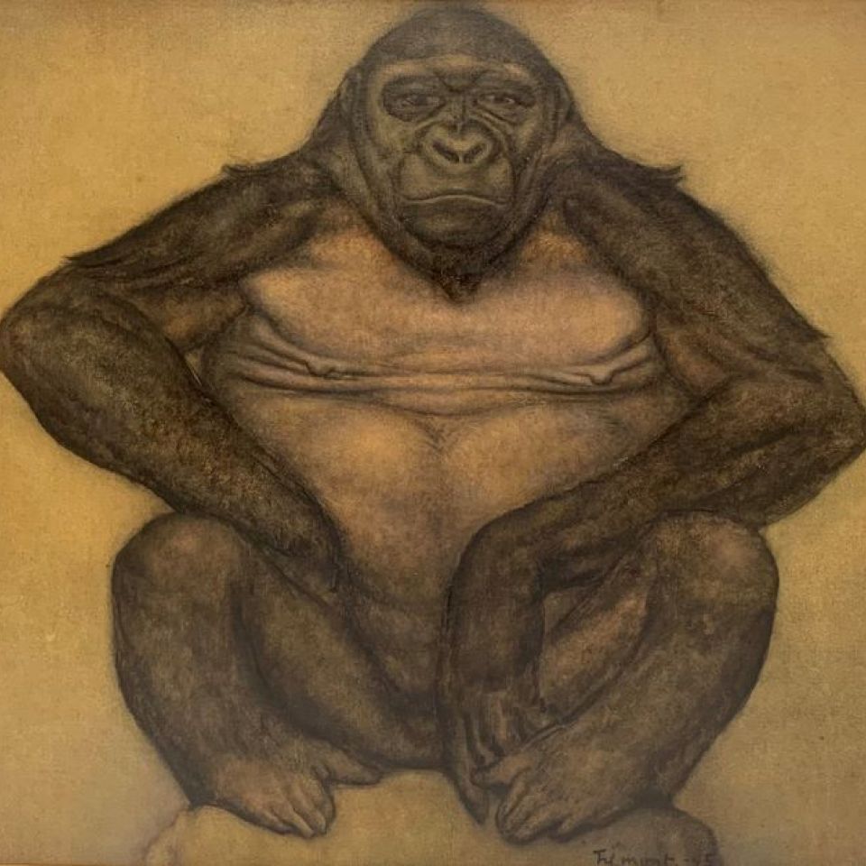 Auguste TREMONT (1892-1980), luxemburgischer Künstler [Prix Grand-Duc Adolphe 1918], Kohle/Kohle auf Platte: Chimpanzée assis (Solange du jardin des plantes), großes Werk auf Platte, unten mittig signiert und datiert 45, kurze Rahmung, die das Werk um mehr als 5 cm beschneidet - Abmessungen außerhalb des Rahmens: 79 x 92,5 cm