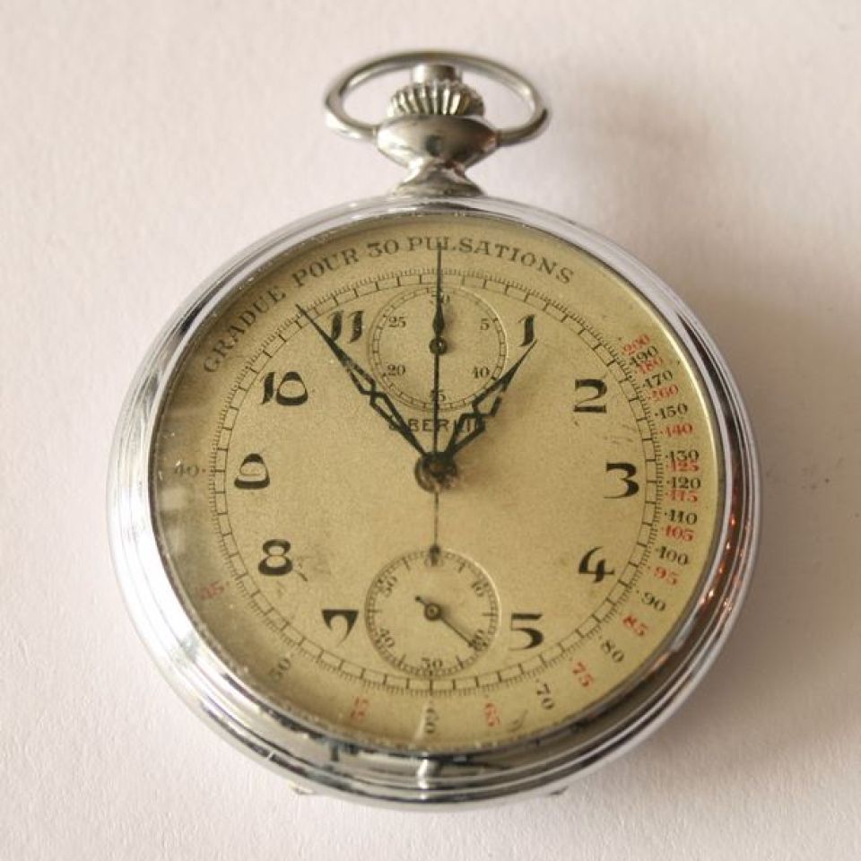 Chronometeruhr in Taschenformat aus verchromtem Metall, OBERLIN, champagnerfarbenes Zifferblatt, funktionstüchtig, zerkratztes Plexiglas - Durchmesser: 50 mm