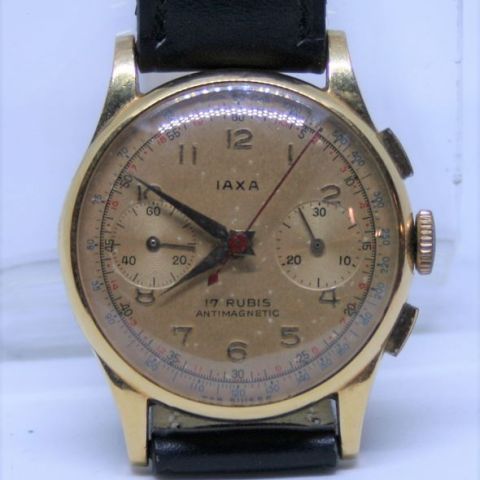 Armbanduhr mit mechanischem Aufzug, IAXA Chronometer 17 Rubine Antimagnetic, Gehäuse aus 18ct Gold, vergoldetes Zifferblatt mit 2 Hilfszifferblättern, Gravur auf der Rückseite "LE SECOURS. 1957", Mechanismus zu überholen (Aufzug lose) - Durchmesser: 34 mm, Dicke: 12 mm, Gewicht: 39,29 g