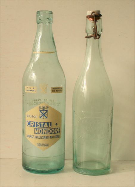 Satz von 2 alten Limonadenflaschen: PLEGER d'Ettelbruck und Cristal MONDORF, ein Porzellanverschluss.