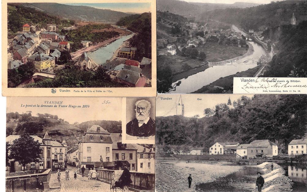In einem Ordner, eine Sammlung von 57 Postkarten von VIANDEN (speziell Victor HUGO und einige Stadtansichten), von 1900 bis 1930, einige neuere (ehemalige Sammlung ABENS).