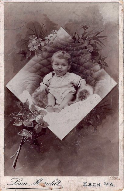 Auf starken Karton aufgezogene Fotografie des Fotografen Léon MAROLDT aus Esch/Luxemburg, ca. 1890: Junges Mädchen - Maße: 16,5 x 10,5 cm