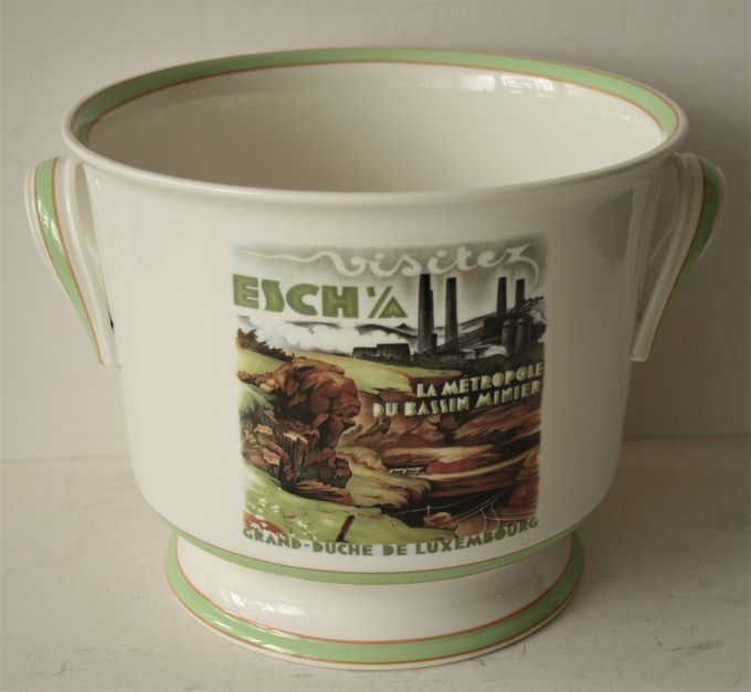 Champagnersiegel VILLEROY & BOCH "angeboten an LL. AA. RR. Der Erbgroßherzog und die Erbgroßherzogin anlässlich des Nationalfeiertags 1997 in Esch-sur-Alzette", verziert mit einer Komposition "Besuchen Sie Eschs/Alzette" - Höhe: 18,5 cm