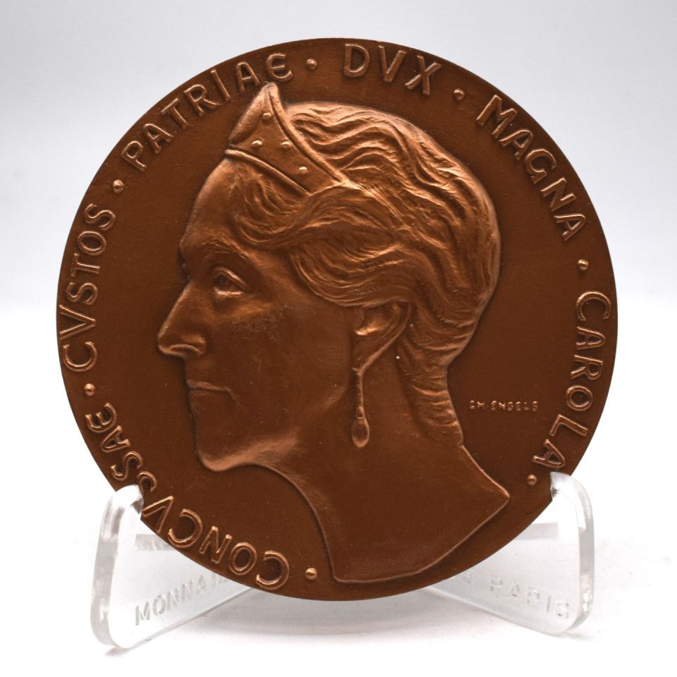 Bronzemedaille zur Erinnerung an Schloss Fischbach, Großherzogin Charlotte auf der Rückseite, entworfen von Charlotte ENGELS (1920-1993) [Großherzog-Adolf-Preis 1952], Plexiglasstaffelei, Durchmesser 68 mm