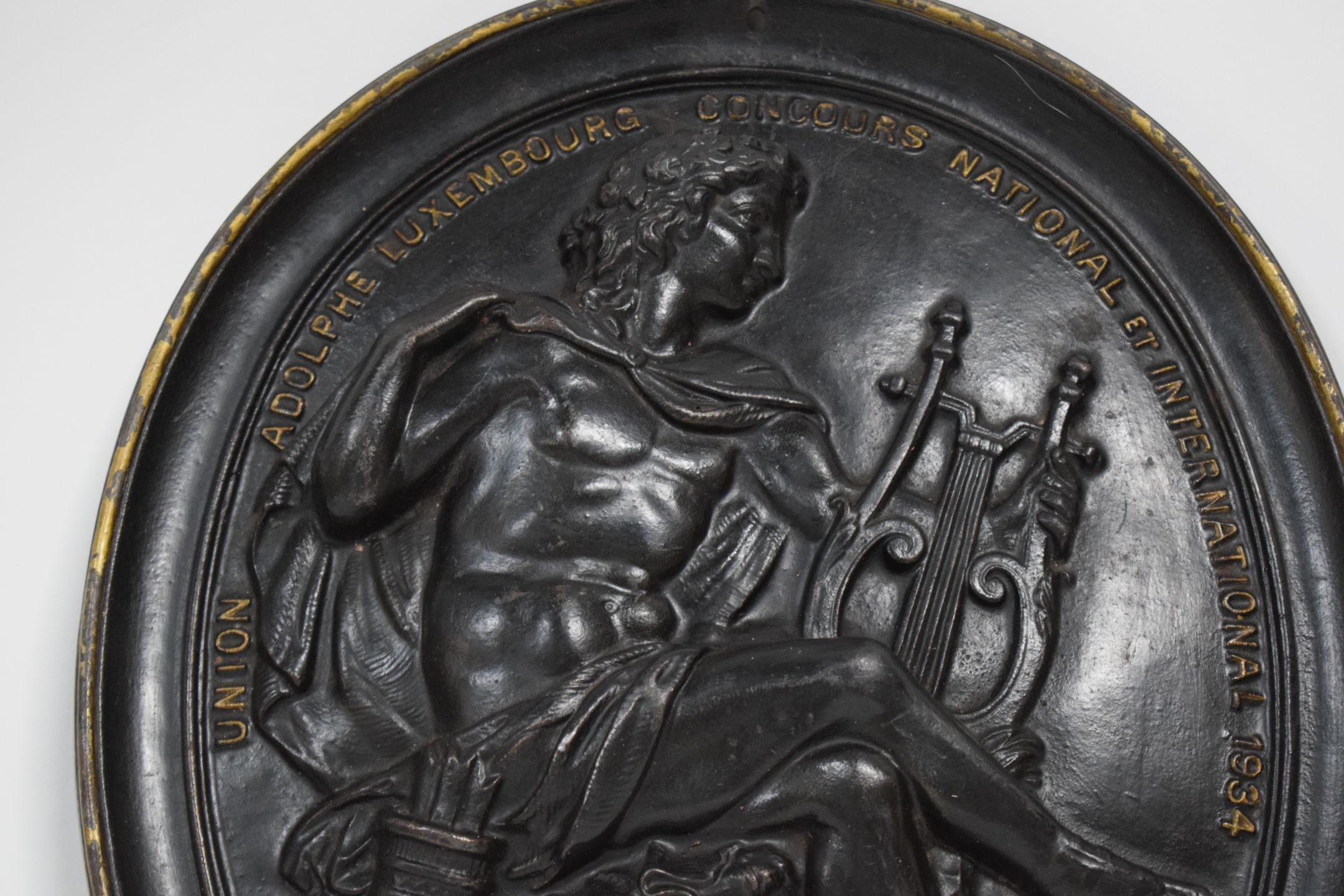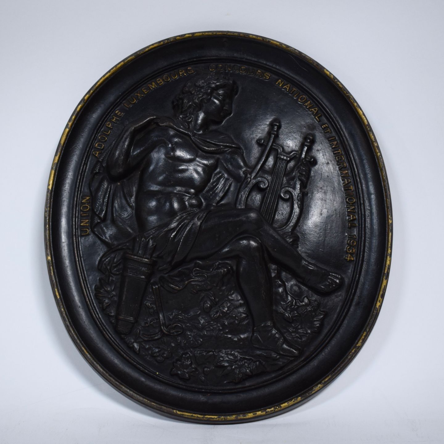 Große ovale Medaille aus Gusseisen (Gießerei DUSCHER in Wecker), die beim Nationalen und Internationalen Wettbewerb 1934 der UGDA verliehen wurde. Die Figur des Orpheus ist darauf abgebildet, guter Allgemeinzustand, 39,5 x 34 cm.