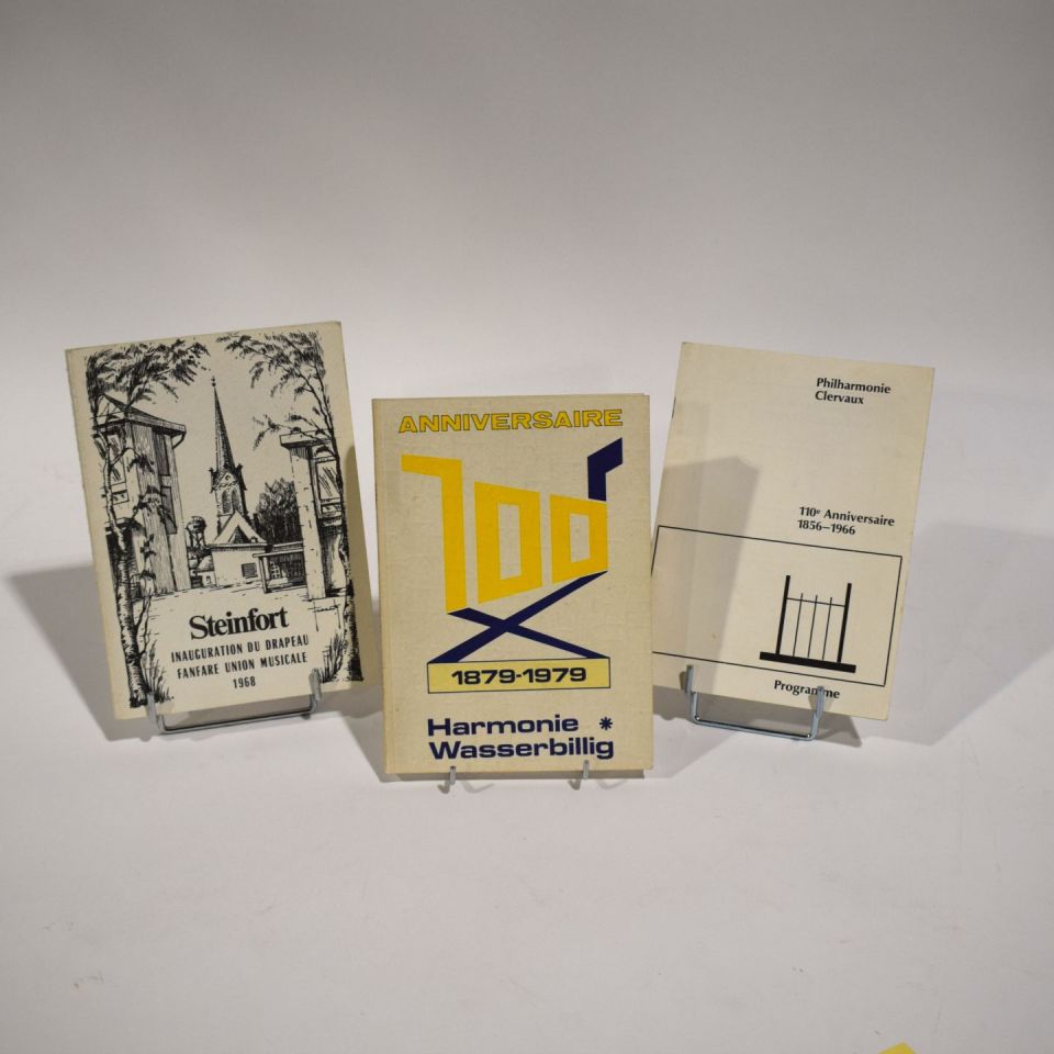 1) Steinfort Flaggenweihe Fanfare Union musicale 1968, Imprimerie Bourg-Bourger, 2) 100. Jahrestag 1879-1979 Harmonie Wasserbillig, Imprimerie Zierden, 3) Philarmonie Clervaux 110. Jahrestag 1856-1966, Programm, Imprimerie Bourg-Bourger