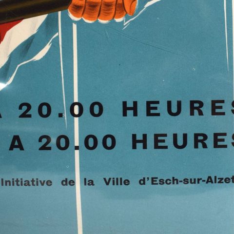 Schönes Plakat des internationalen Turnwettbewerbs 1964, der in der staatlichen Berufsschule in Esch/Alzette zwischen Luxemburg, England und Frankreich organisiert wurde. Zeichnung von Wissmer, Druckerei Huss. Hervorragender Zustand. 98 x 62 cm