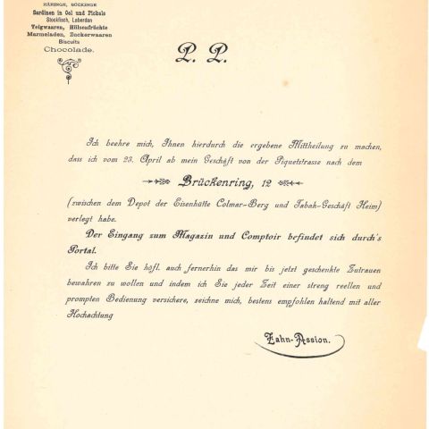 Gedruckter informativer Brief an die Kunden der Schokoladenfirma Zahn-Assion in Luxemburg anlässlich der Änderung der Adresse des Geschäfts, 1901, guter Zustand, 29 x 22 cm