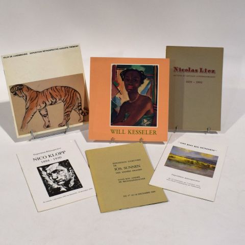 Zusammenstellung von Ausstellungsbroschüren über luxemburgische Künstler: 1) Retrospektive Ausstellung Nico KLOPP von 1994, 2) Nicolas LIEZ, Ausstellung 1960 im Staatsmuseum, 3) Jos. SUNNEN, Ausstellung in seinem Atelier 1969 (mit Einladungskarte), 4) Retrospektive Ausstellung von Auguste Trémont 1980, 5) Will KESSELER, Ausstellung Villa Vauban 1988, 6) Retrospektive Ausstellung von 100 Joer Jos Sünnen 1994.