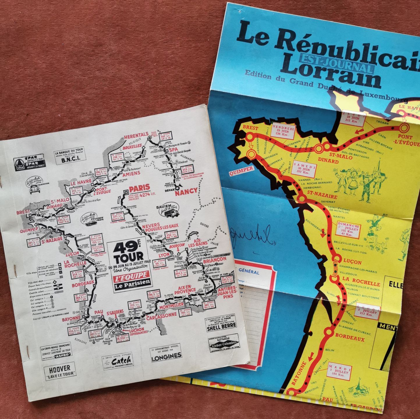 Etappenbuch der 49. Tour de France 1962 mit allen Etappen im Detail, darunter die Etappe durch Luxemburg Nancy-Spa, herausgegeben von der Zeitung L'Équipe.
