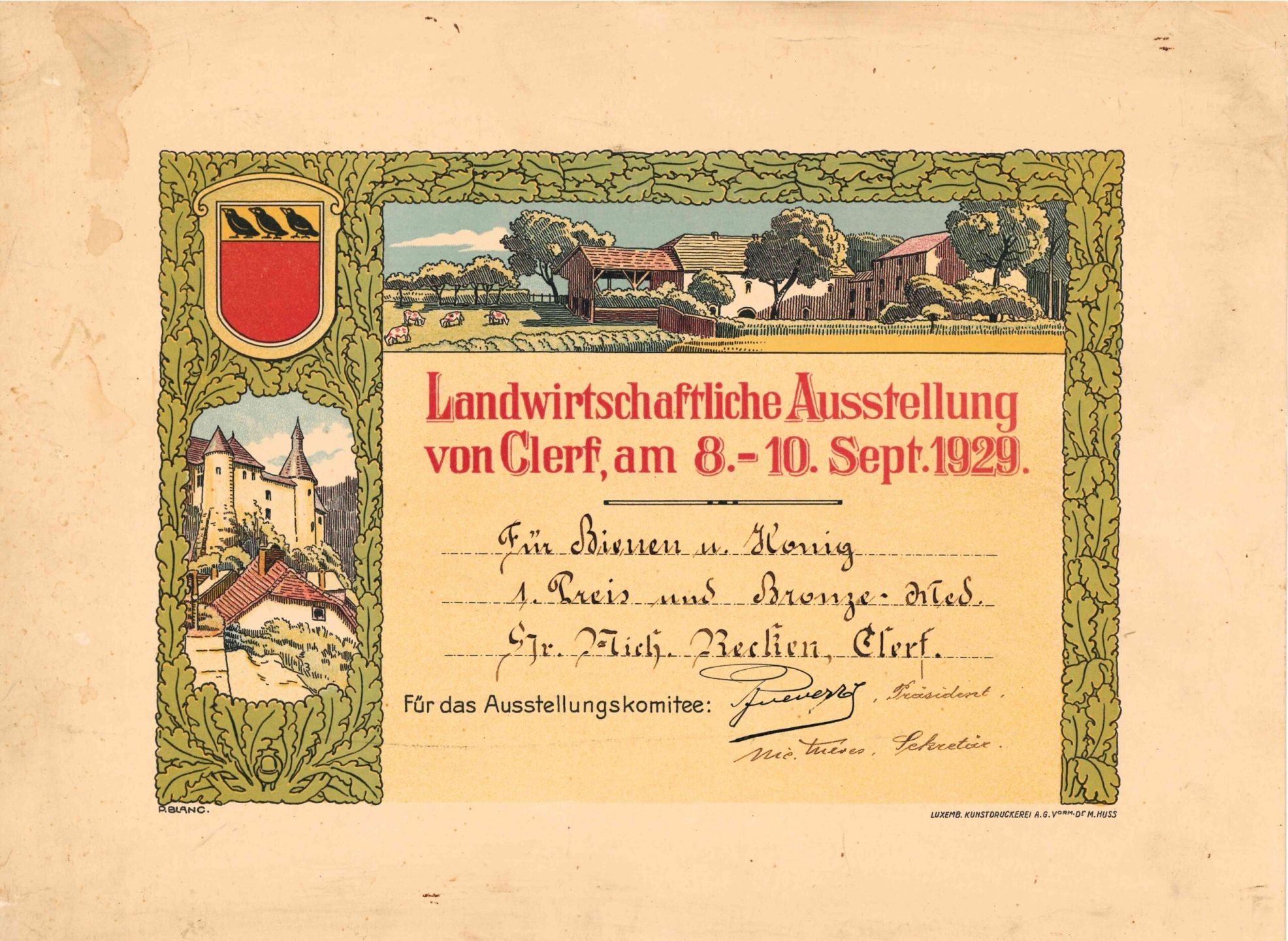 Diplom, gezeichnet von Pierre Blanc: Landwirtschaftliche Ausstellung von Clerf, am 8. Sept. 1929.